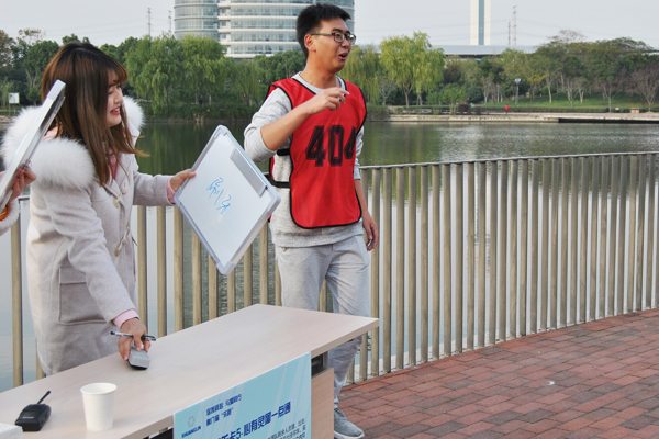 参赛团队轮流派出1人根据指示词比划,由团队剩余人员猜,比划者只能用肢体语言的形式向猜词者传达信息,不得说出任何字,完成1个指示词后,替换比划者,猜不出可喊pass,在5分钟之内完成5个指示词,任务完成。